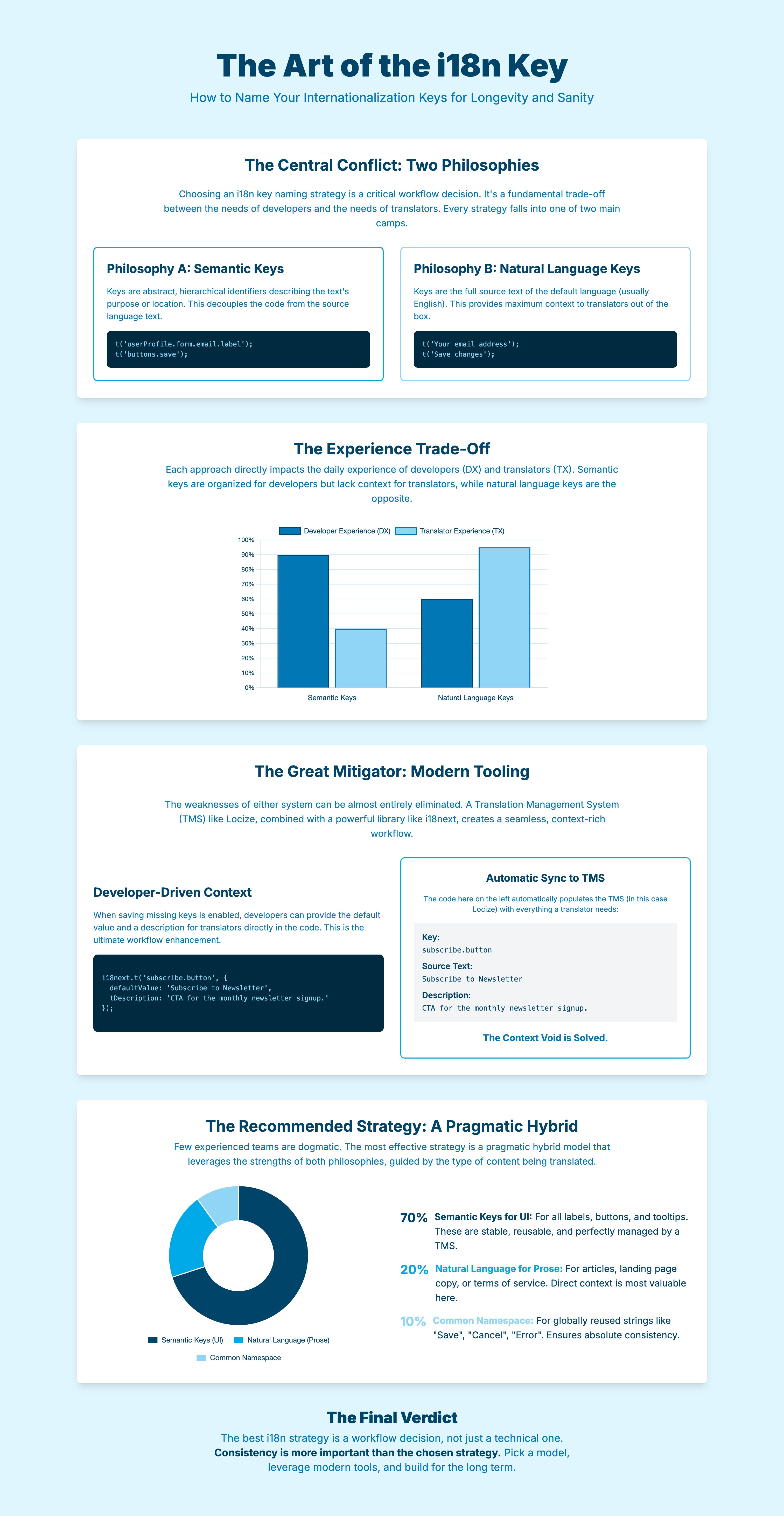 Internationalization (i18n) is the blueprint for global software. At its heart lies a deceptively simple element: the translation key. Your team's approach to naming these keys isn't a minor detail — it's a foundational architectural decision. A poor strategy creates “i18n debt,” a silent tax on every future feature that slows development and inflates costs. A great one ensures longevity and streamlines collaboration for years to come.
