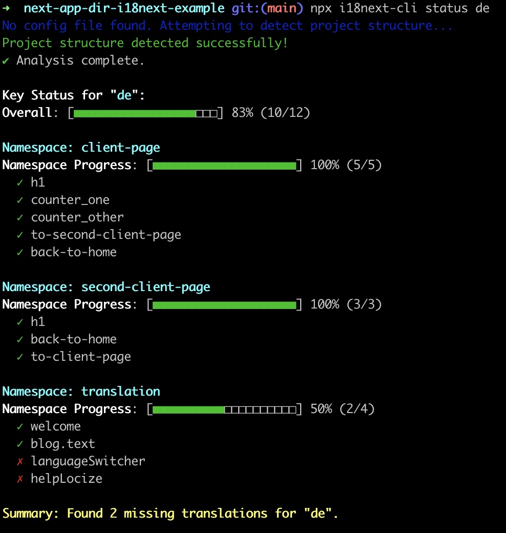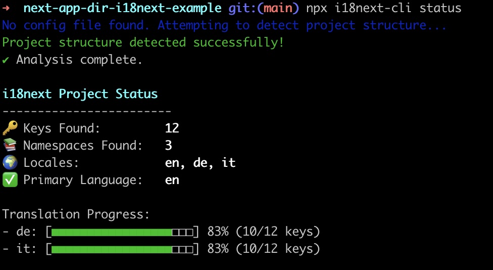 npx i18next-cli statusIt heuristically detects your project structure and gives you a report in seconds.