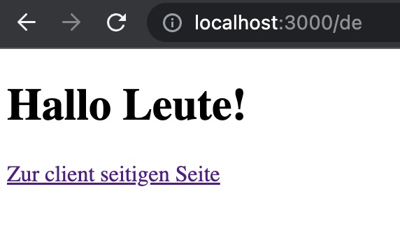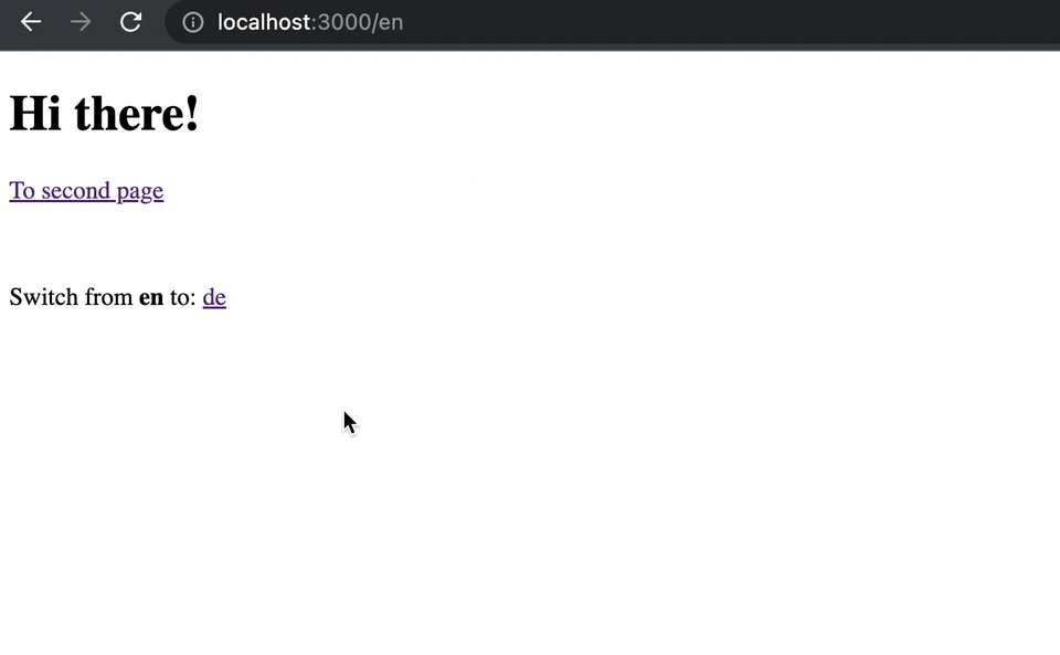 Now navigating to http://localhost:3000/en or http://localhost:3000/de should show something, and also the links to the second page and back should work, but navigating to http://localhost:3000 will return a 404 error.