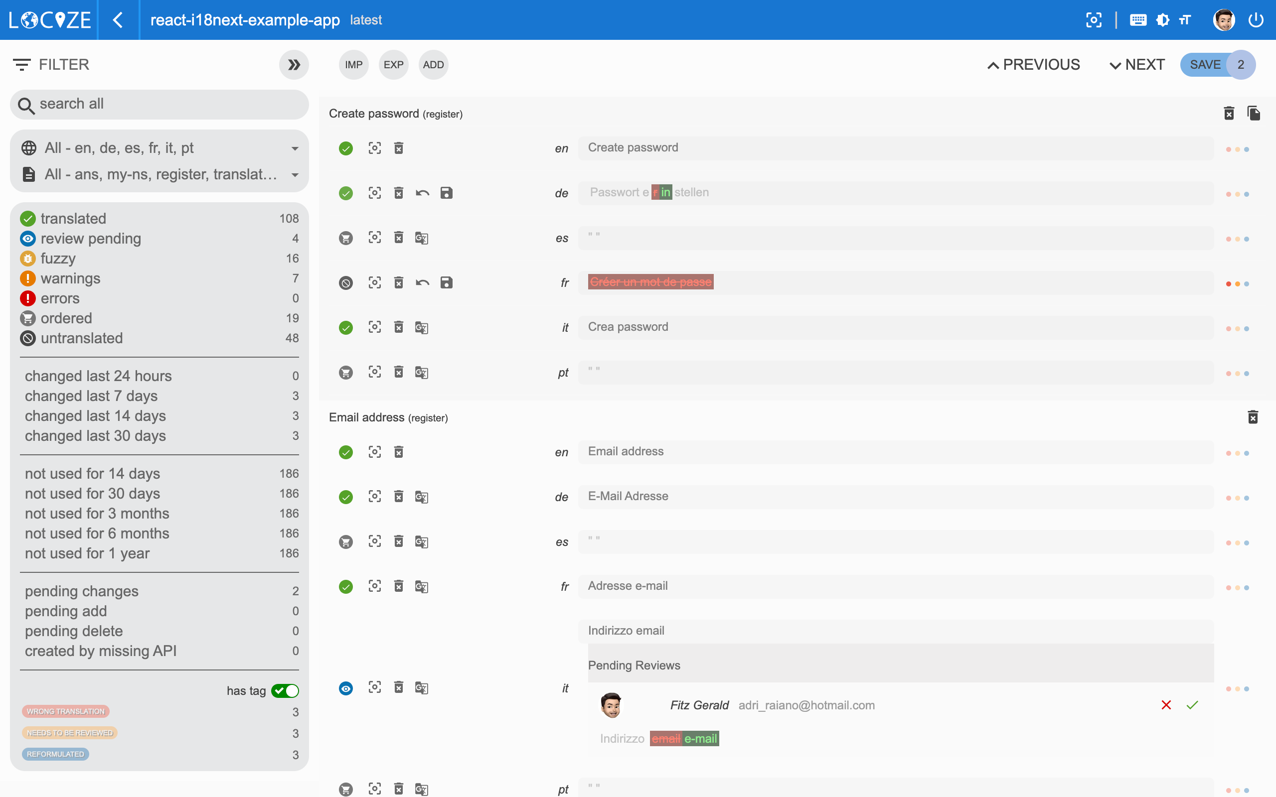Within Locize there is a ready-to-go CAT tool comprising three distinct views.