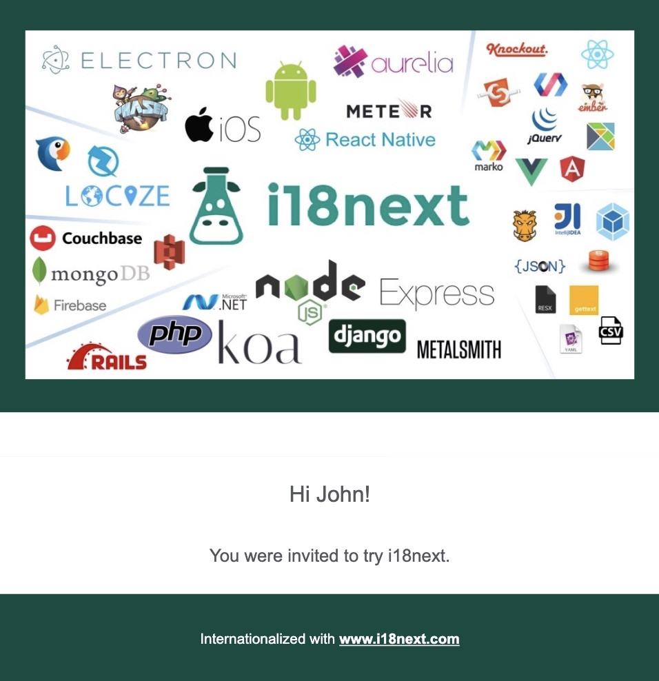 We will show some examples that uses i18next as i18n framework. If you're curious to know why we suggest i18next, have a look at this page.