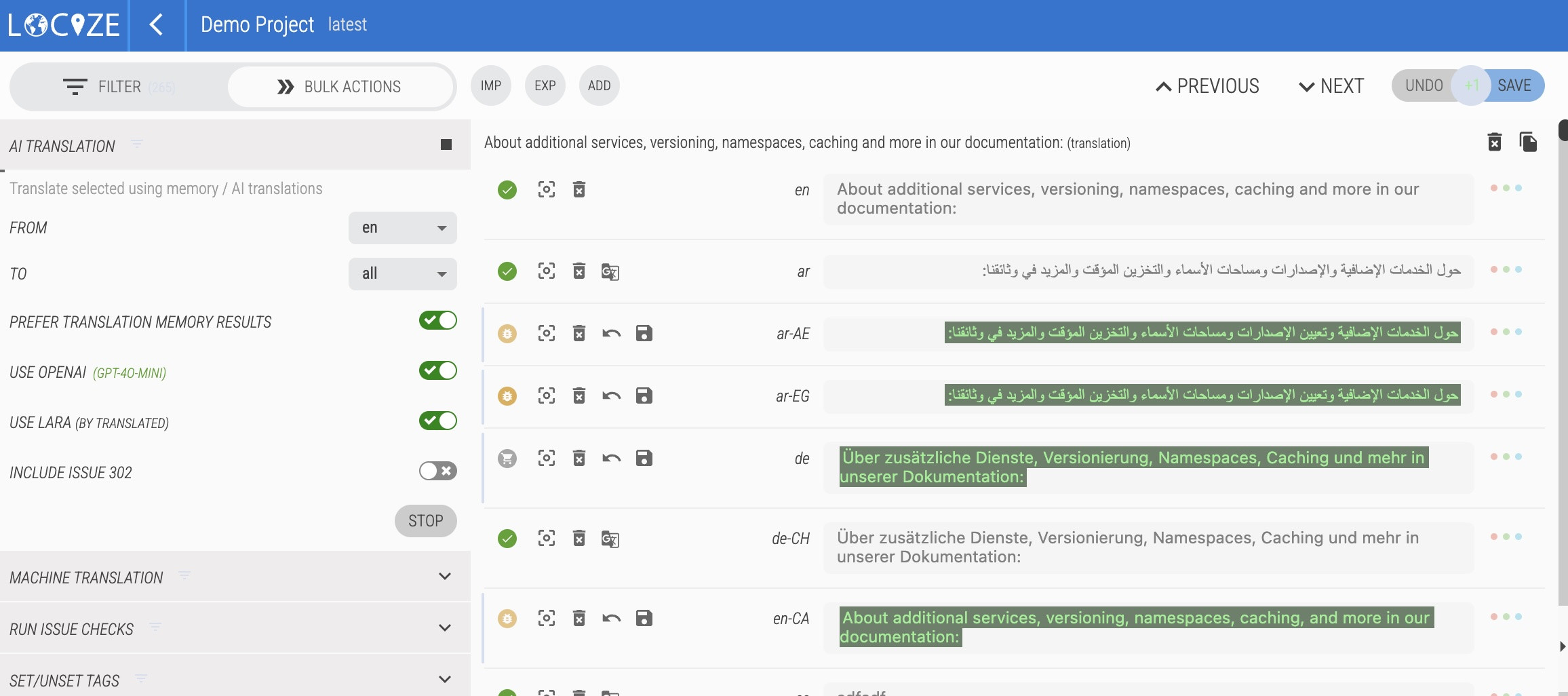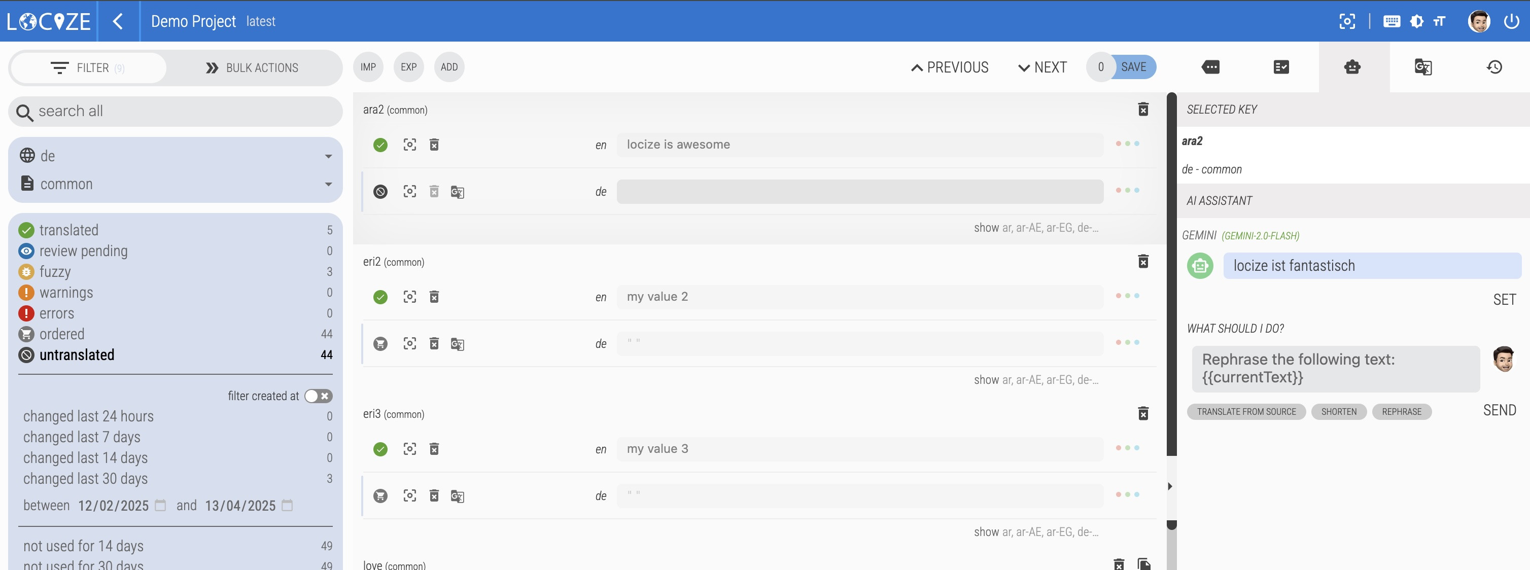 - Human review: Translators/reviewers use Locize filters (fuzzy state, tags) or the Review Workflow to easily find and check the AI-generated translations.