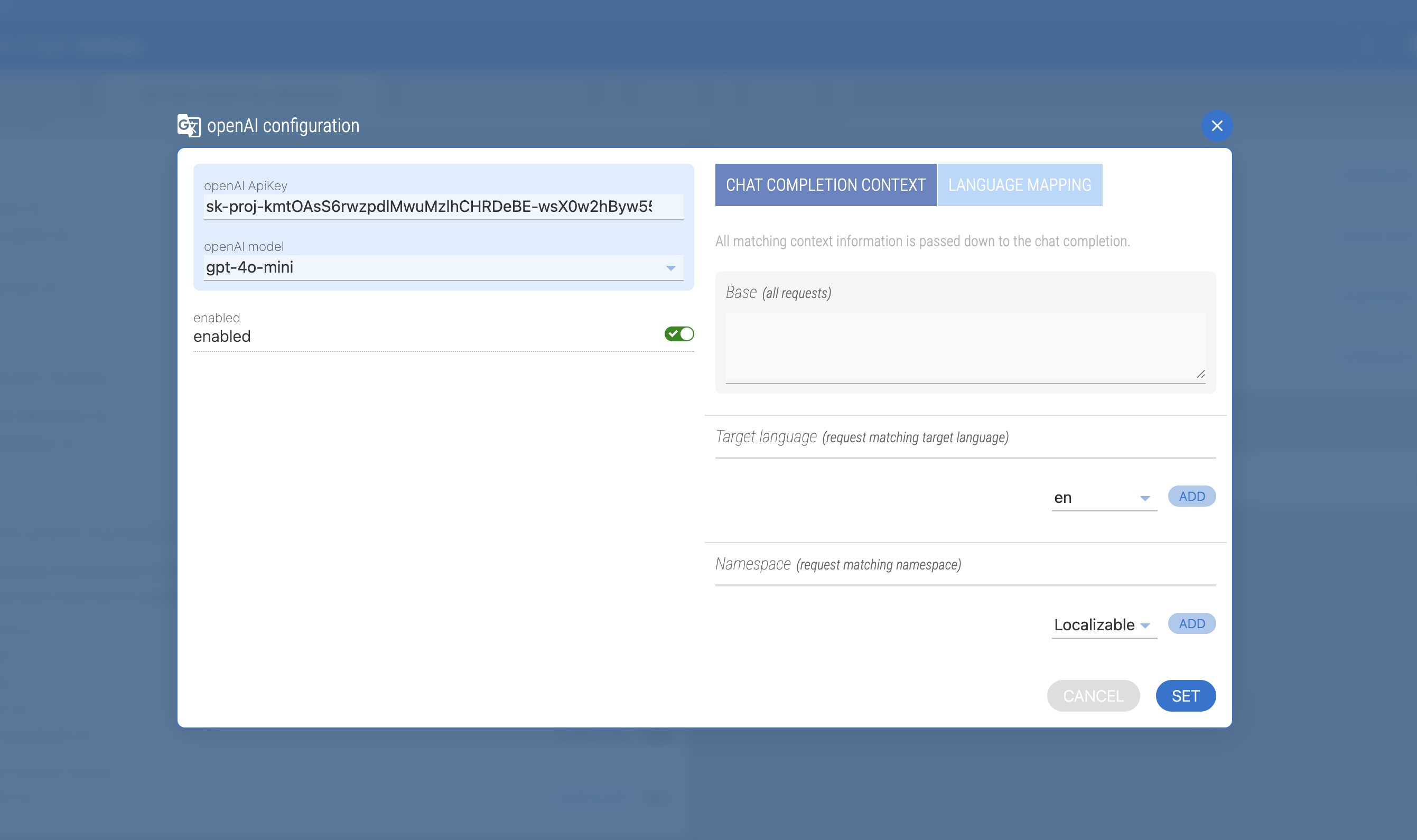 You can choose from several generative AI services, like OpenAI, Gemini, Mistral AI, Lara, etc. Simply bring your own API key for your desired service and you’re good to go. Optionally, you can define custom context, etc.