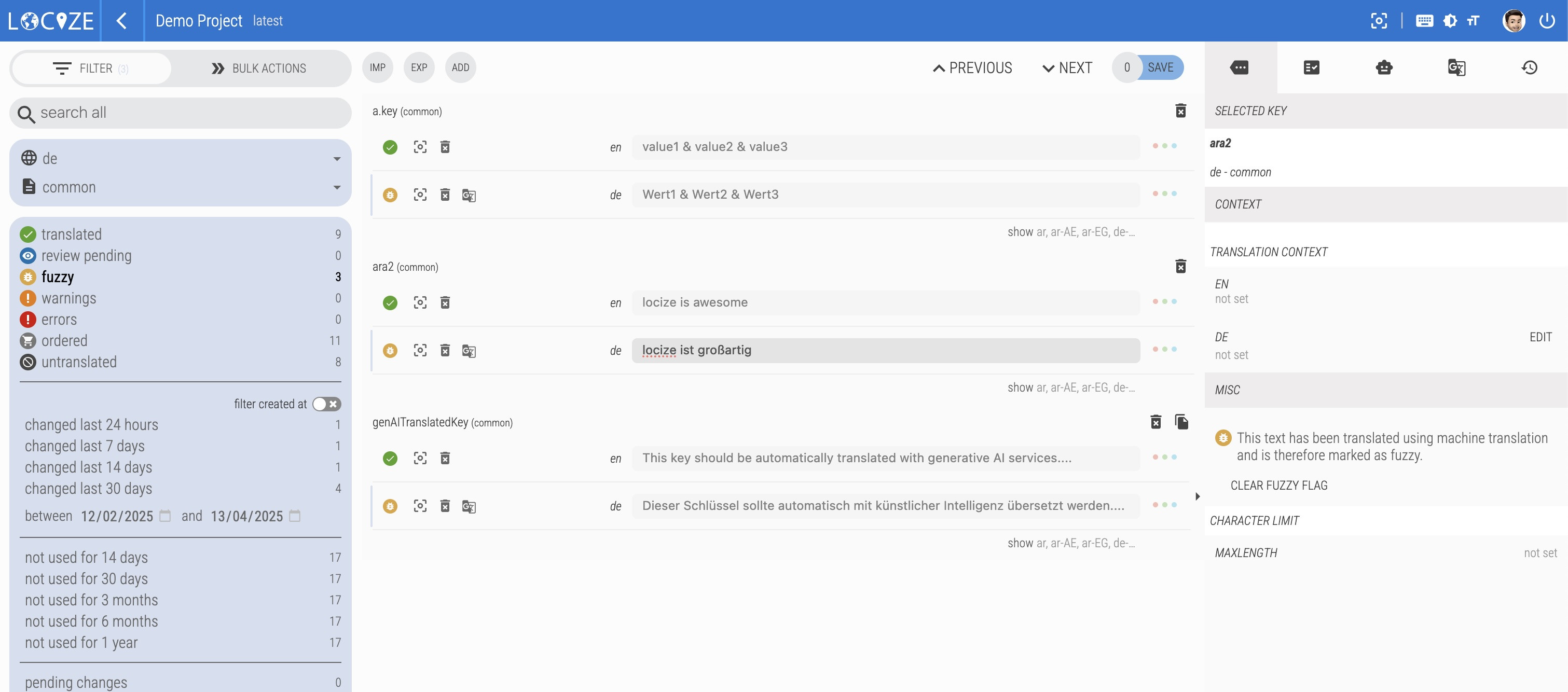 - Workflow: Review each fuzzy translation. If it’s accurate, unmark it as fuzzy. If it needs correction, edit it directly in Locize and save (which automatically unfuzzies it).