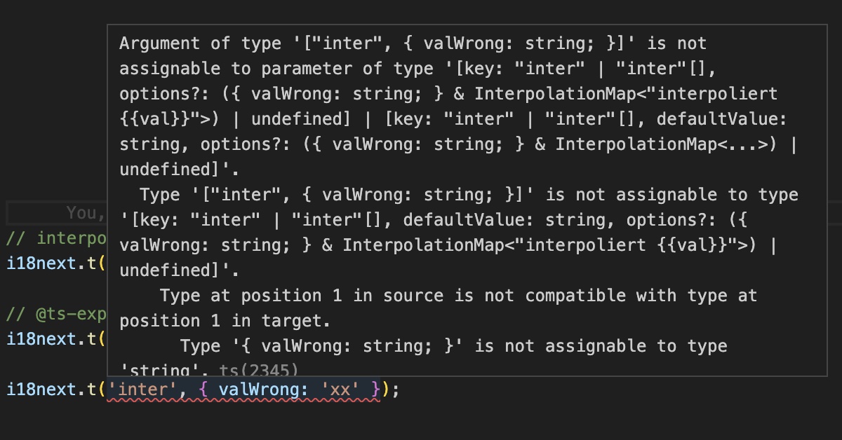 Nevertheless, with the advent of the new iterations of i18next, that limitation has been overcome (thanks largely to Pedro Durek). Now, i18n keys boast complete type safety. Whenever a developer employs a non-existent or modified i18n key, the TypeScript compiler immediately raises an error, promptly alerting you to the issue before it gives rise to runtime complications. In addition, there is also an improved intellisense experience.