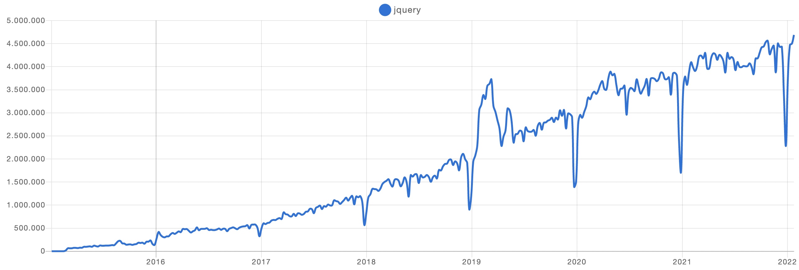 Checking the npm download trends of the jquery module it is approaching the 5 million downloads per week.