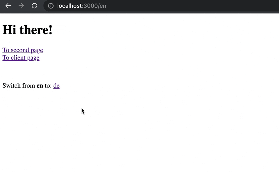 Now navigating to http://localhost:3000/en or http://localhost:3000/de should show something, and also the links to the second page and back should work, but navigating to http://localhost:3000 will return a 404 error.