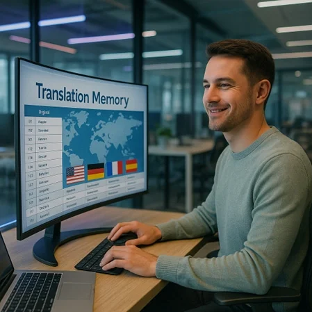 A translation memory (TM) is a database in which translated sentence or segment pairs have already been stored. Each stored sentence has a unit, the so-called translation unit, as a finished translation. For subsequent projects, the system compares new texts with these units and immediately suggests identical or similar passages. In this way, translators can make targeted use of tried and tested formulations, thereby maintaining a high degree of terminological consistency and shortening their processing time.
