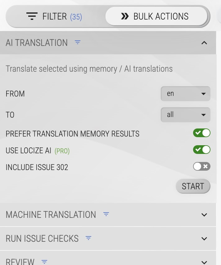 Automatic Translation lets Locize translate newly created keys in your reference language into all target languages automatically — using Machine Translation (MT) or Generative AI (depending on your project setup).