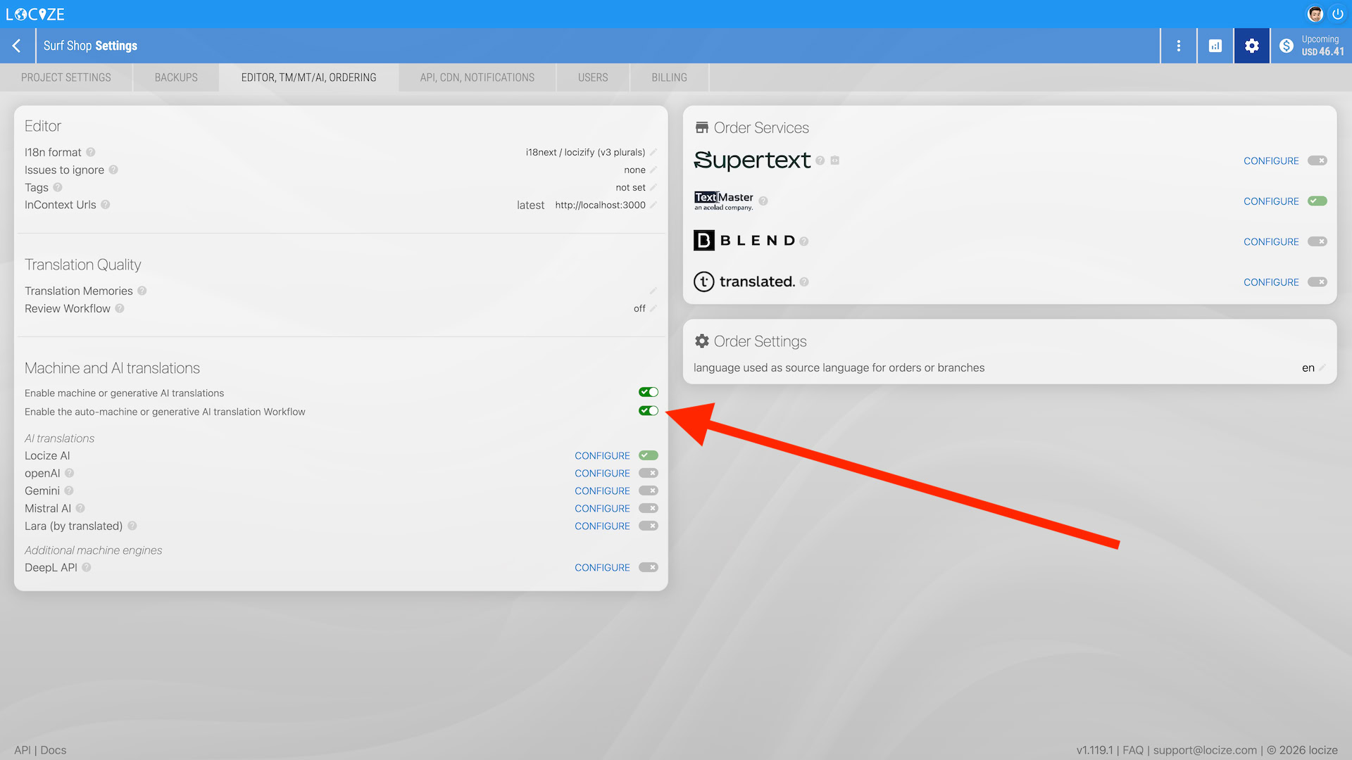 - In Cat settings, enable Enable the automatic translation Workflow.