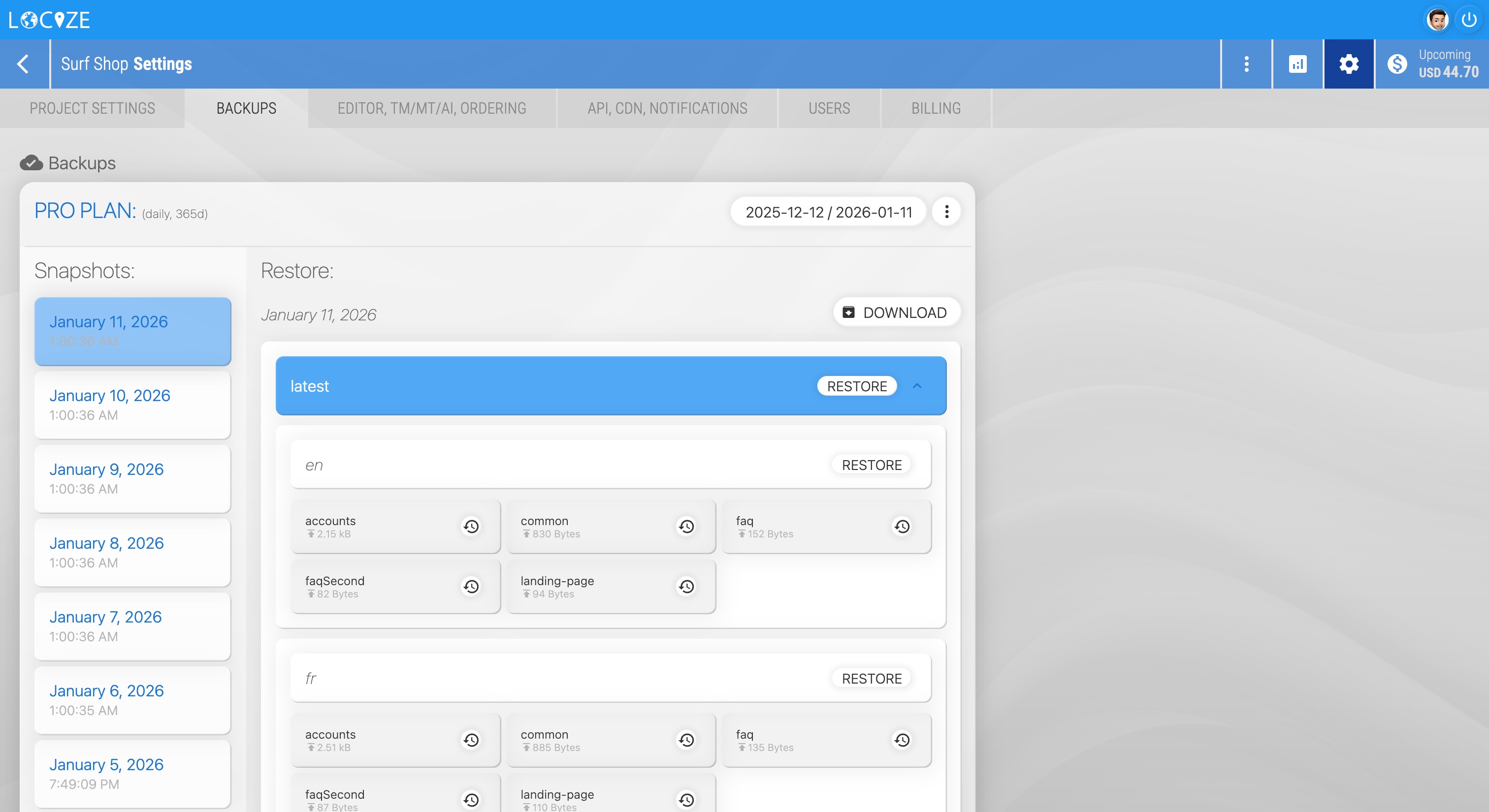 Automatic backups of your namespaces. Safe, simple and fully managed — pick a plan, configure how often you want snapshots and how long you want to keep them. Use the Backups tab to browse snapshots, download them as a ZIP or restore any version / language / namespace.