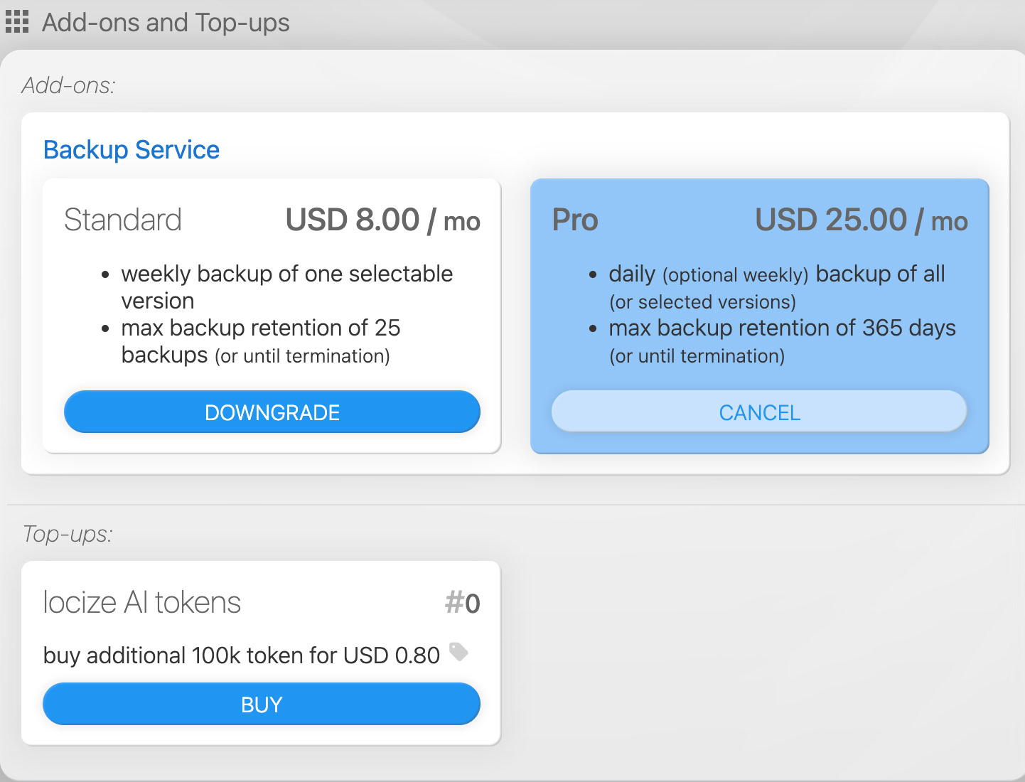 - Under Backup Service, choose Standard or Pro and confirm purchase.