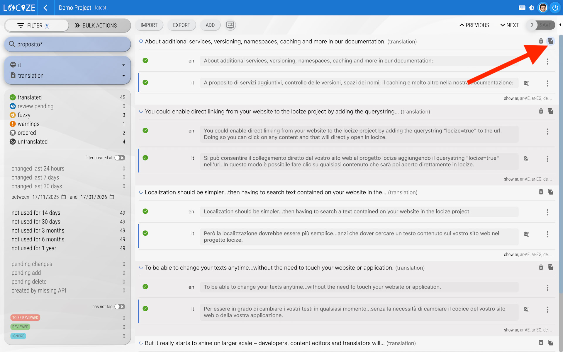 Sometimes you need to reorganize your translations by copying, moving, or renaming keys (segments) or even changing their namespace. Locize makes this easy to do directly in the CAT (Computer-Assisted Translation) interface / Translation Editor.