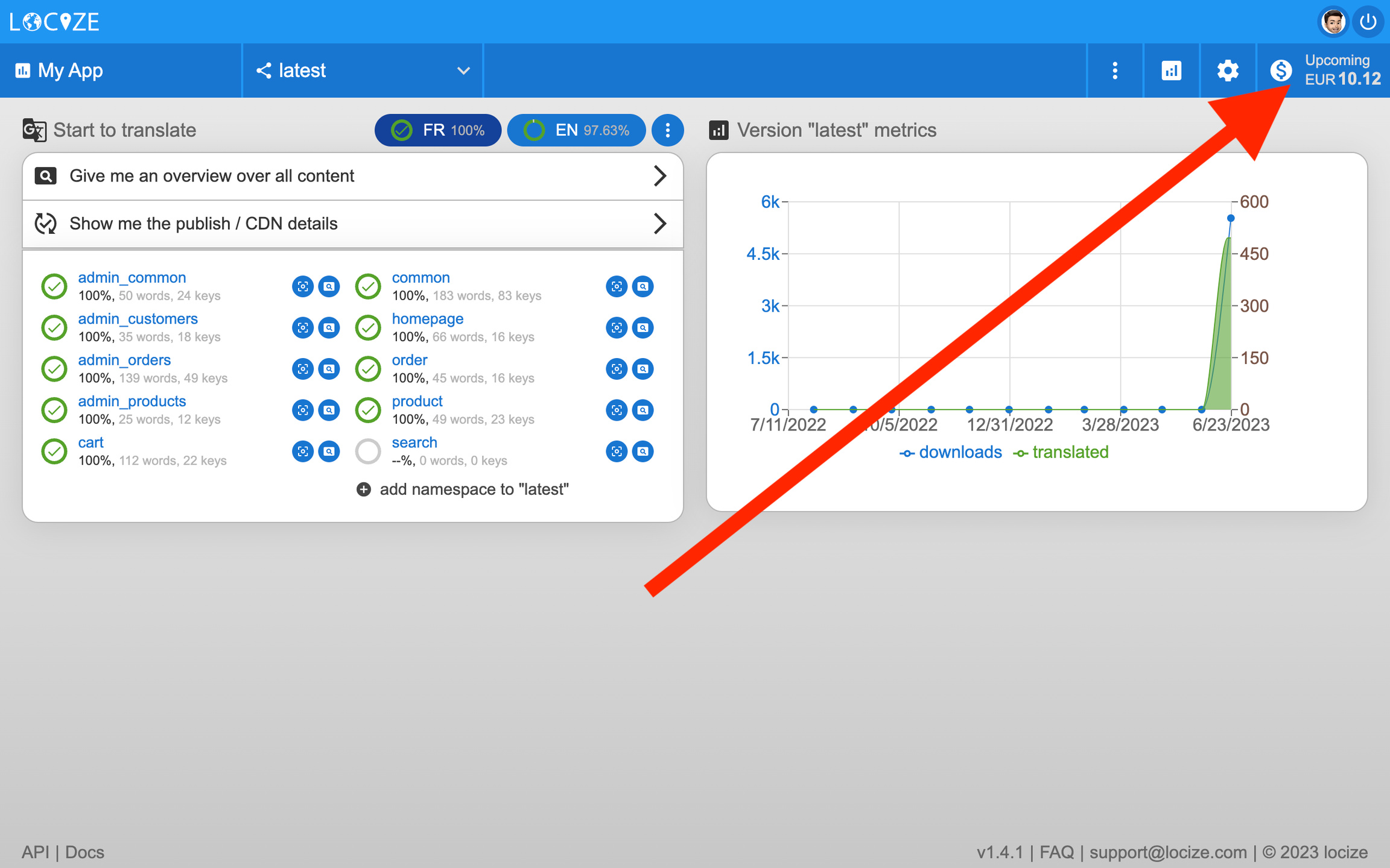 Note: You need to have admin or accountant permissions to access the billing page. If you don’t see the billing option, ask a project admin to adapt your permissions or in case you are not part of the locize project yet, ask a project admin to invite you with the appropriate role.