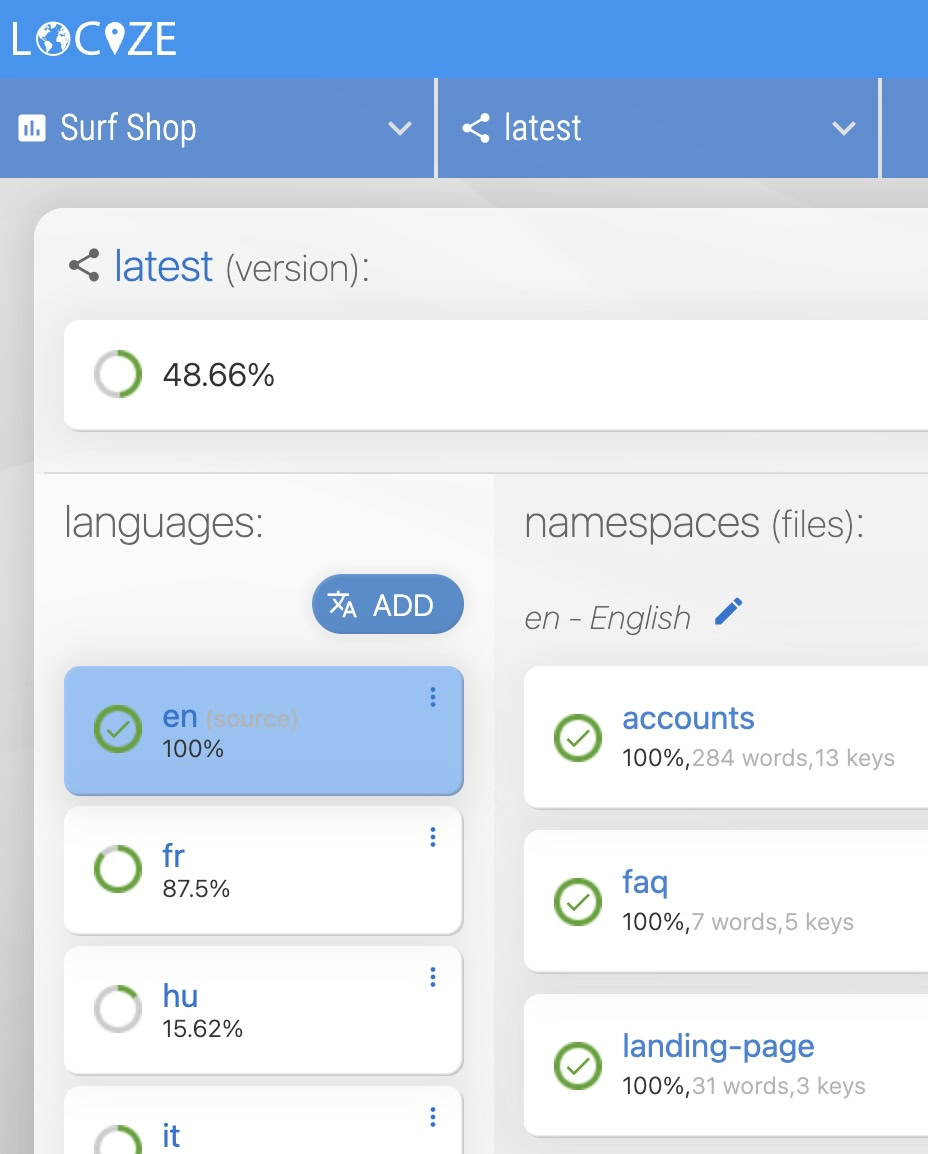 Add the languages you want to translate into. Click the "ADD" button in the languages section in your project dashboard: