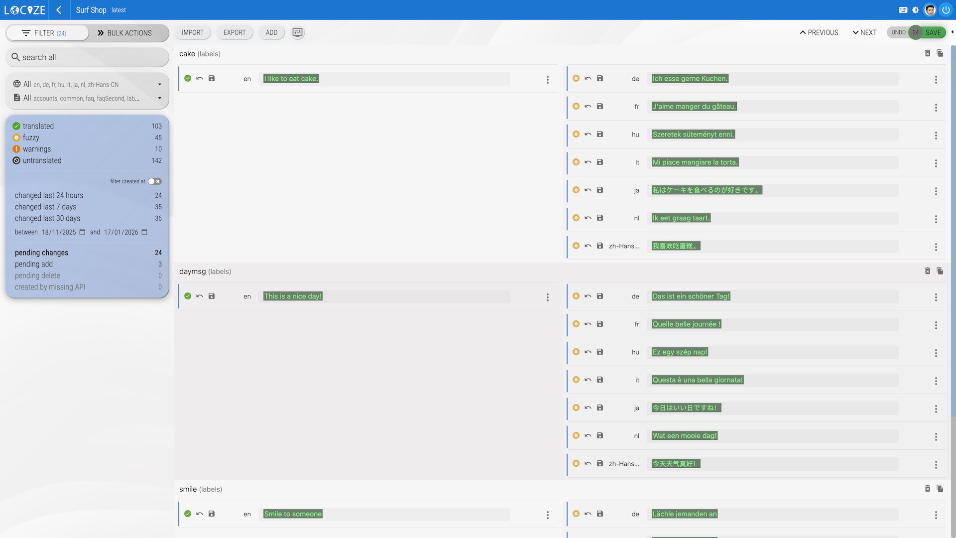 Start translating. Make sure to click the "SAVE" button after making changes. Note: The machine translation feature is disabled during the trial.