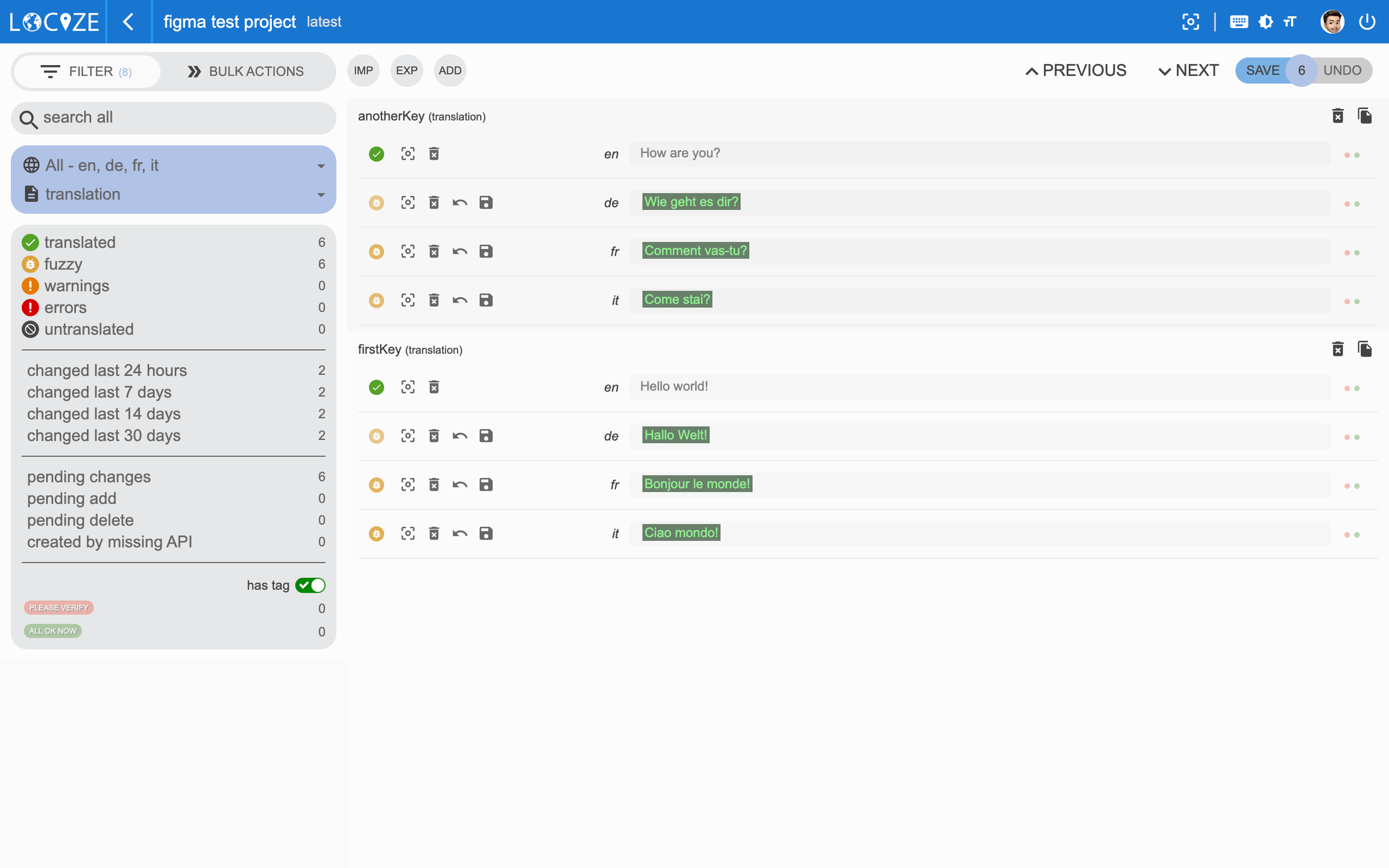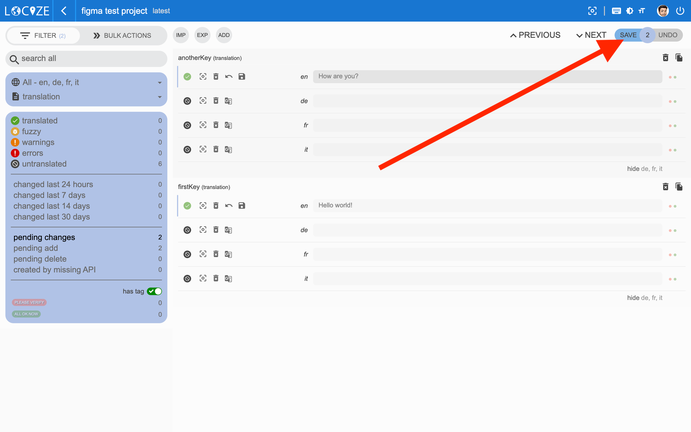 Deselect the "pending changes" filter and start to translate. Make sure you click the "SAVE" button: The machine translation feature is disabled during the trial.