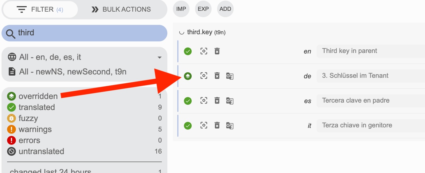 Hint: Because a branch inherits translations from the parent, deleting a key/segment in the branch doesn’t remove the parent value — it will still be visible via inheritance.