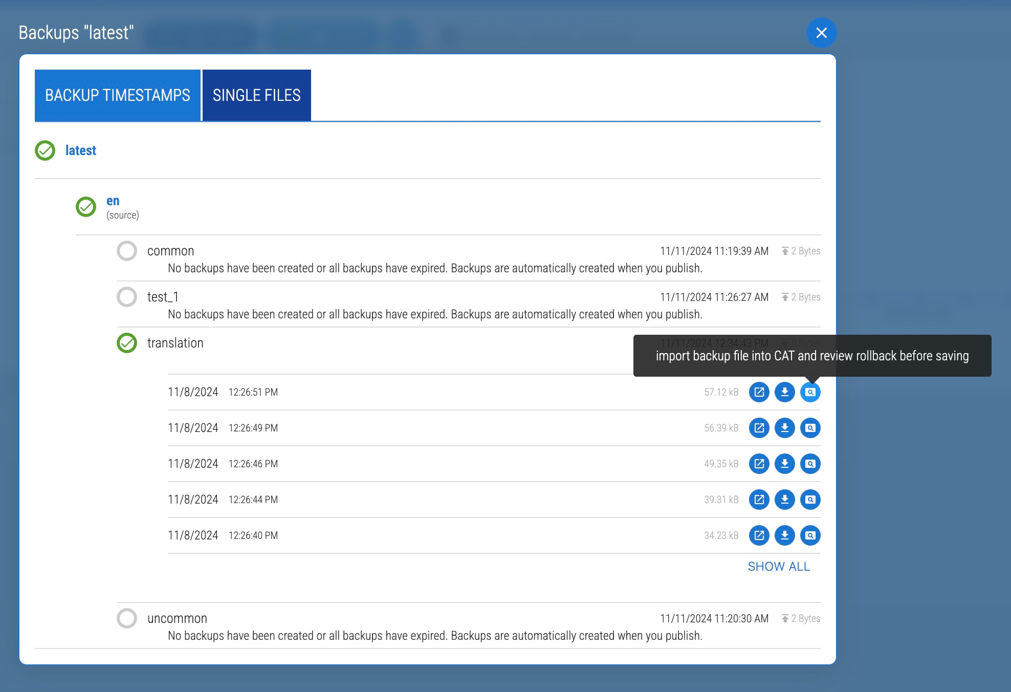 Only the previous/old namespace versions are listed as backups. The current version of the published translations can be found by clicking "Show me the publish / CDN details"