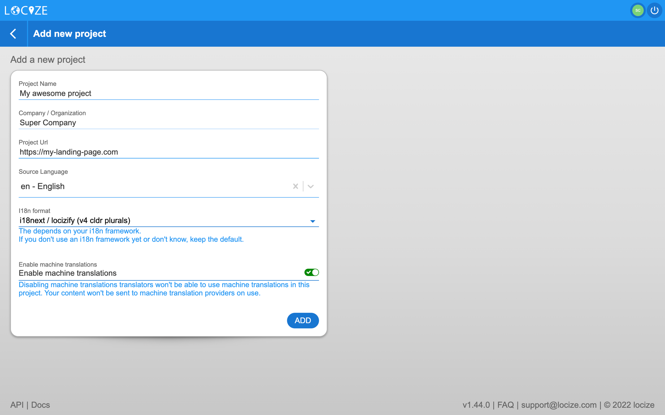 Enter at least a project name a source language and an i18n format.