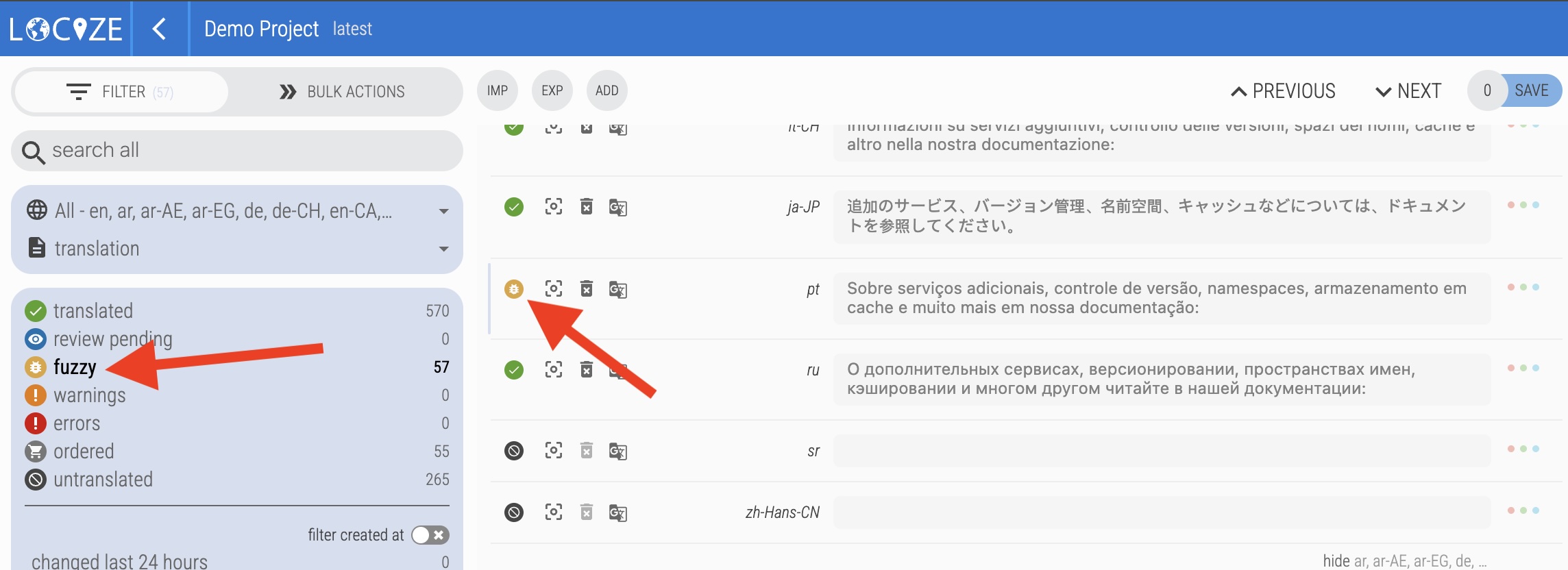 Translations created with the help of machine translation or generative AI services are marked with the fuzzy icon. Filter by those fuzzy translations is an easy starting point to review those generated translations.