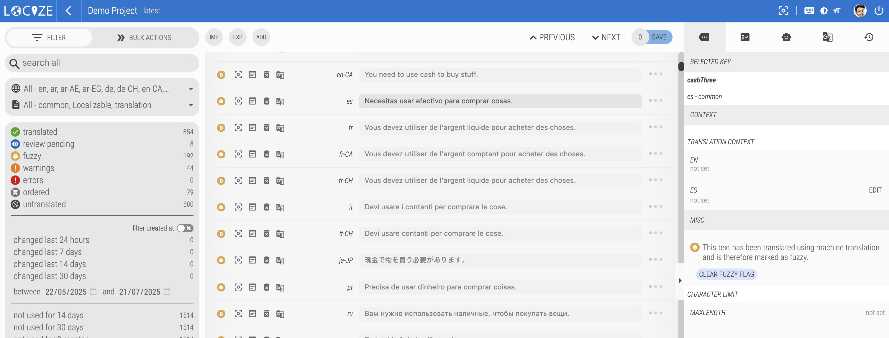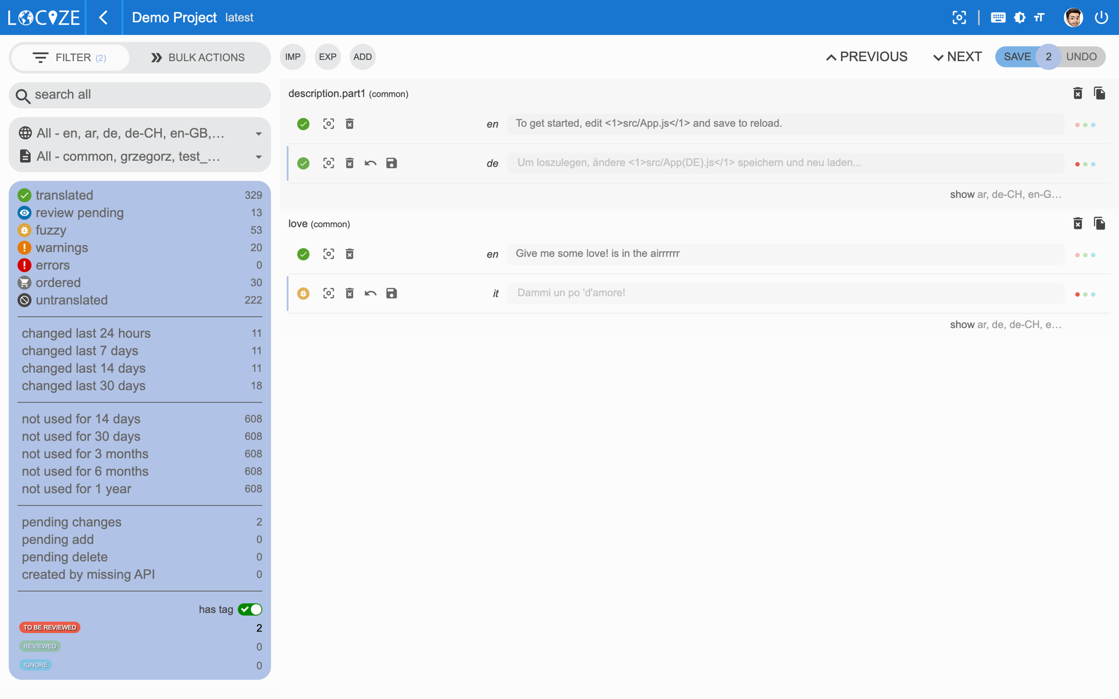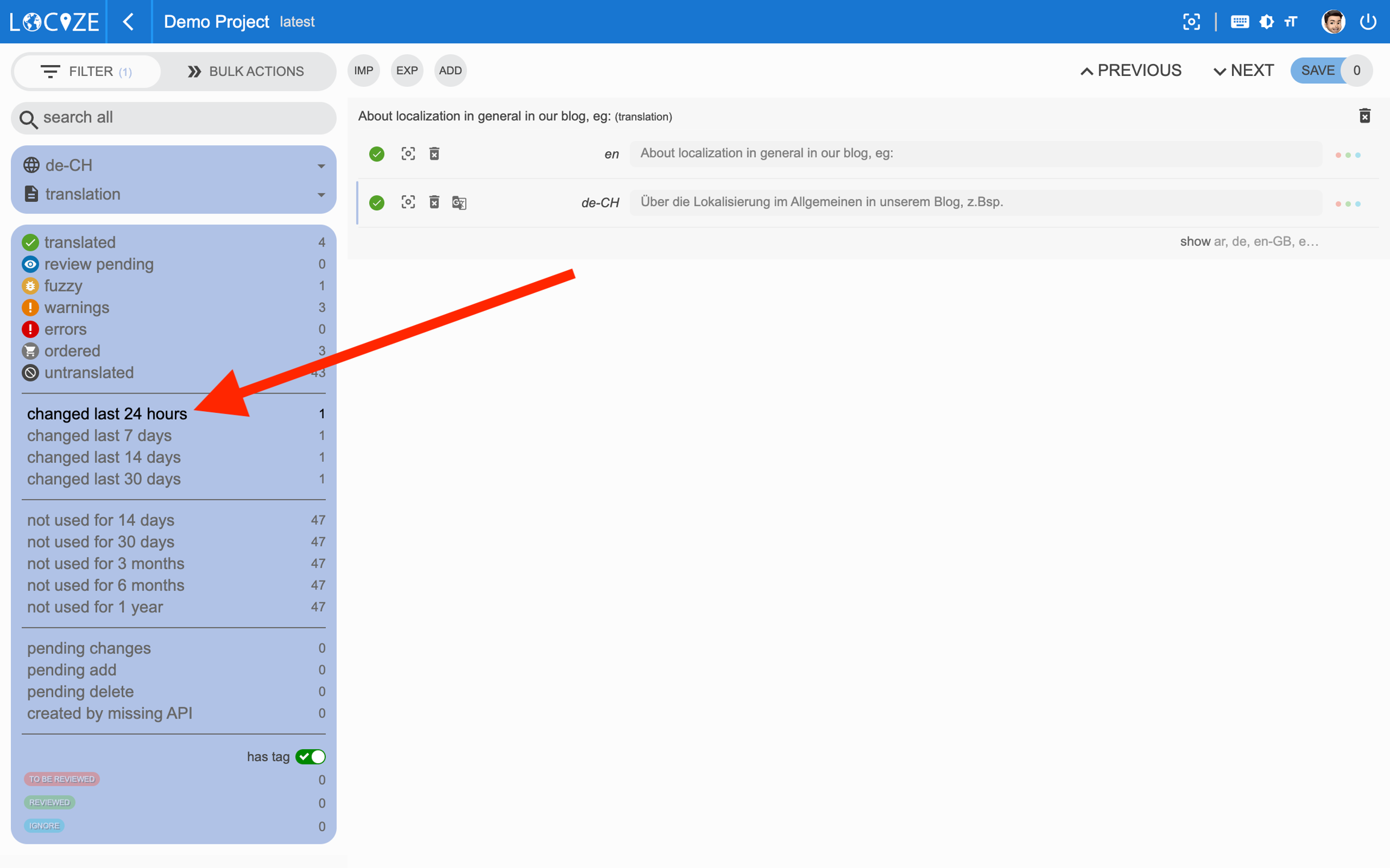 Here you can filter for segments changed in the last couple of days. Best is, to filter for the reference language and then click **changed last x days **in the filter. This way you'll see which changes has been done in that period.