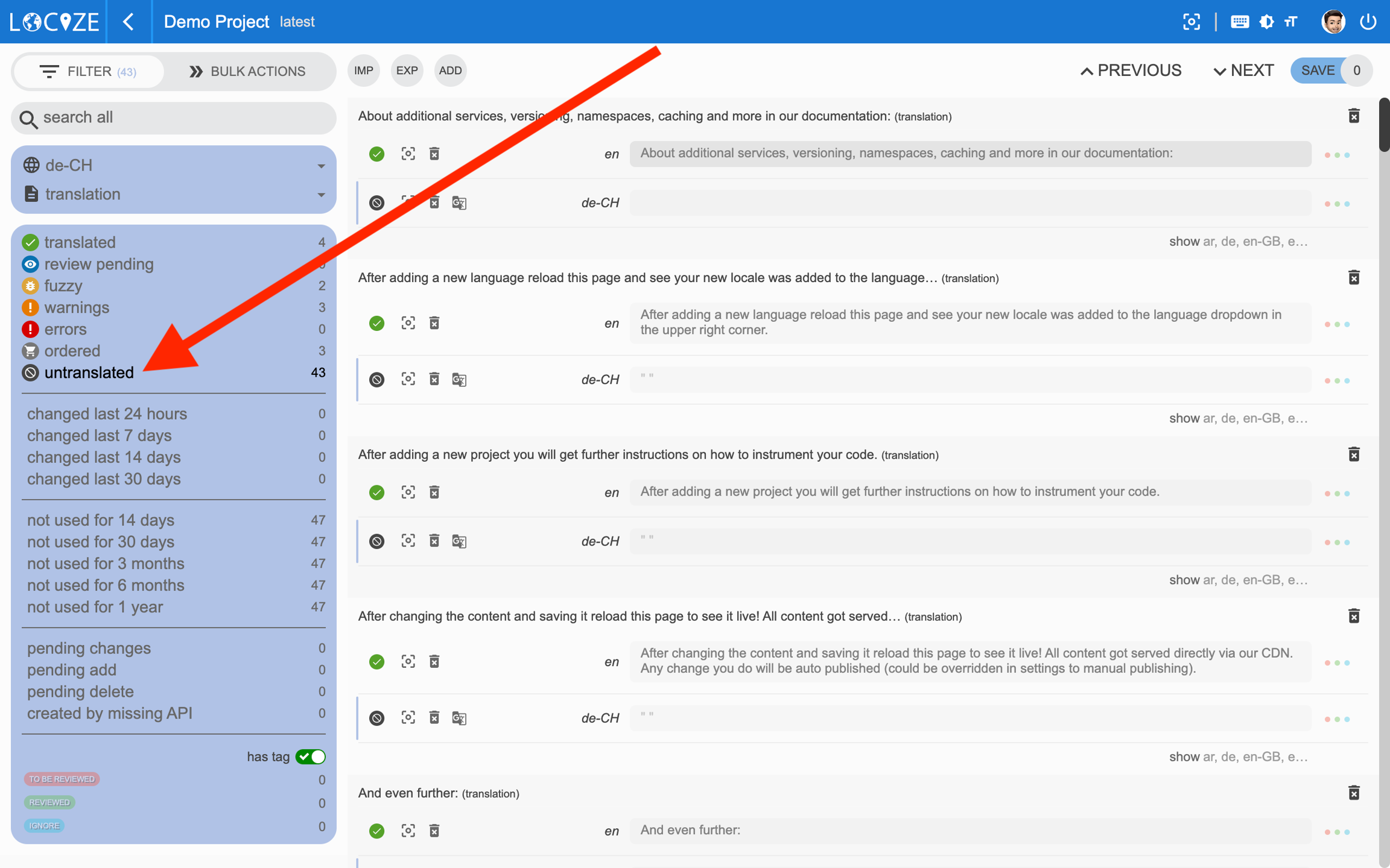 Best is, to filter for the appropriate language and then click **untranslated **in the filter.