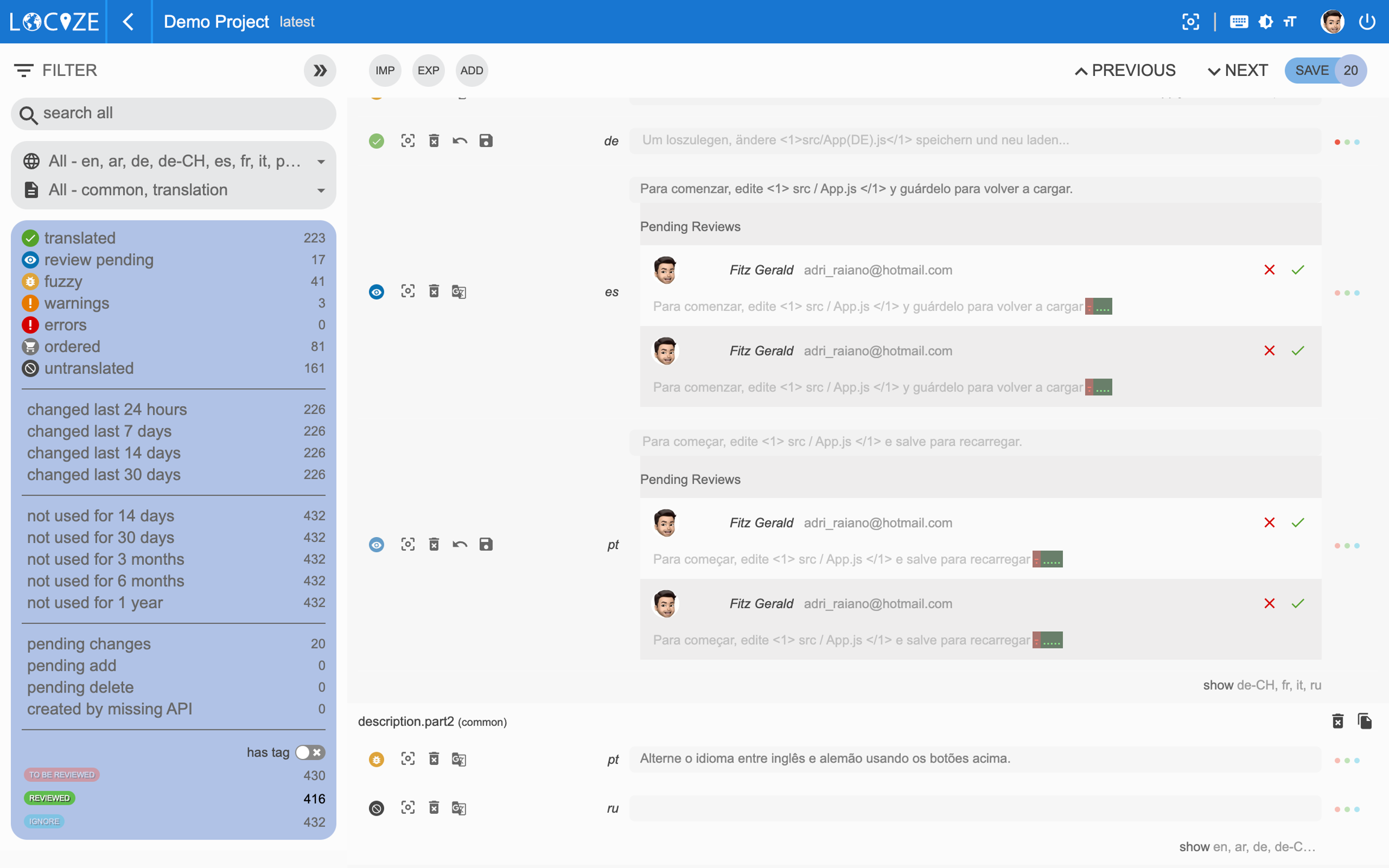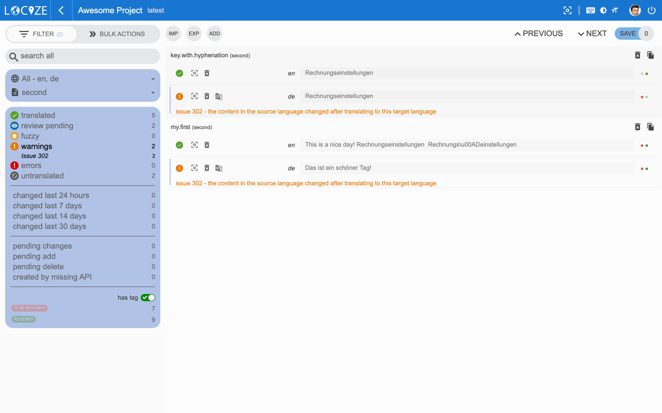 Even better is to filter for warnings (mainly because of issue 302), this issue says that the reference language has been changed, but the target language has not: