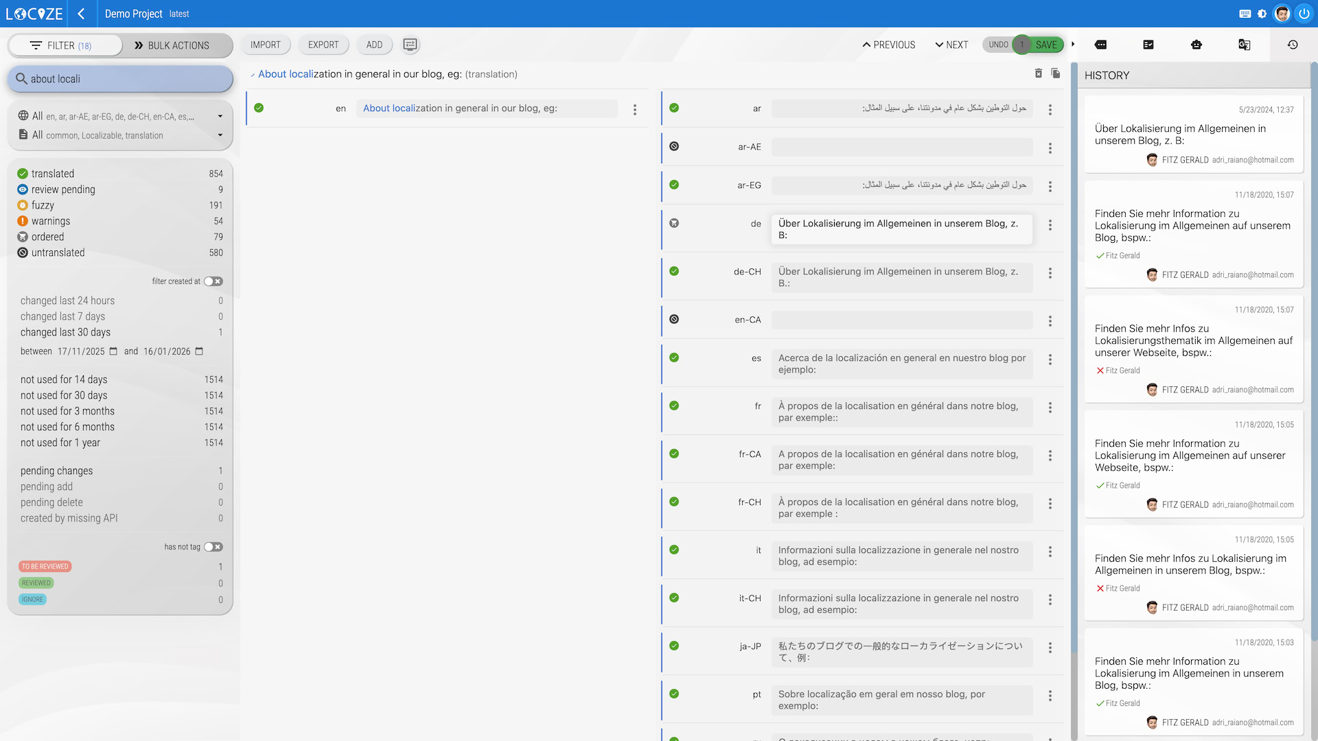 Tracking the history of your translations is essential for quality control, accountability, and collaboration. The history feature in Locize allows you to see exactly when and how each translation was changed, making it easy to audit changes, revert mistakes, and understand the evolution of your content.