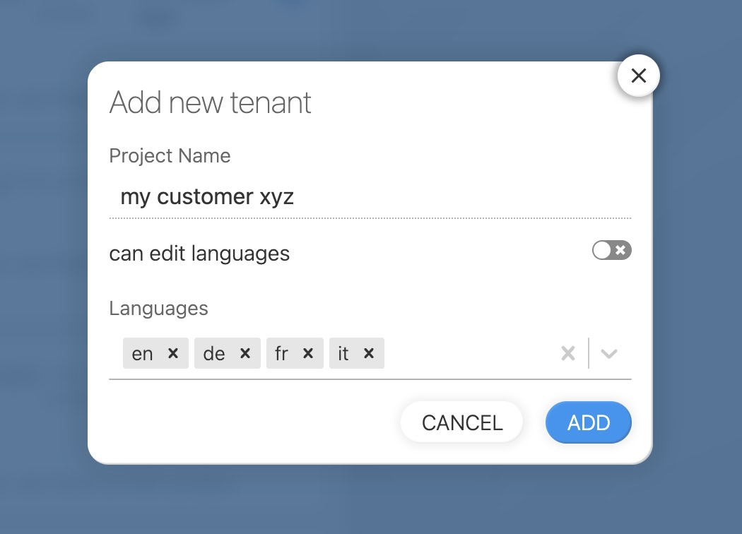 Each tenant project has its own settings, users, API keys, and project ID. To load translations from the CDN, use the tenant project ID found in the settings page.