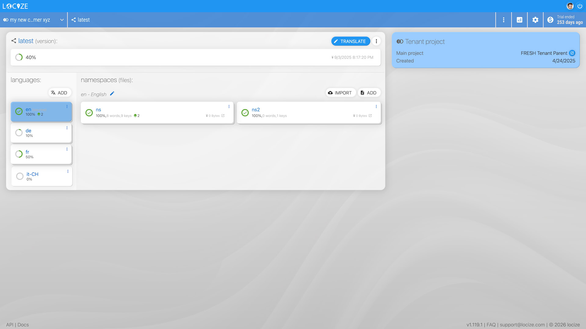 Multi-tenant localization allows you to efficiently manage translations for multiple customers or brands from a single main project, while giving each tenant their own isolated environment. This is ideal for SaaS platforms, white-label solutions, or any scenario where you need to provide customized translations for different clients.