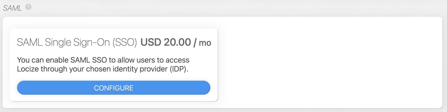 You can enable SAML SSO to allow users to access Locize through your chosen identity provider (IDP).