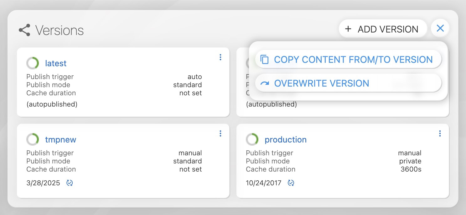 When you're ready to go live, use the "OVERWRITE VERSION" option in the versions menu to overwrite the production version with the content of the latest version. OVERWRITE is faster than COPY TO and does not incur modification costs.