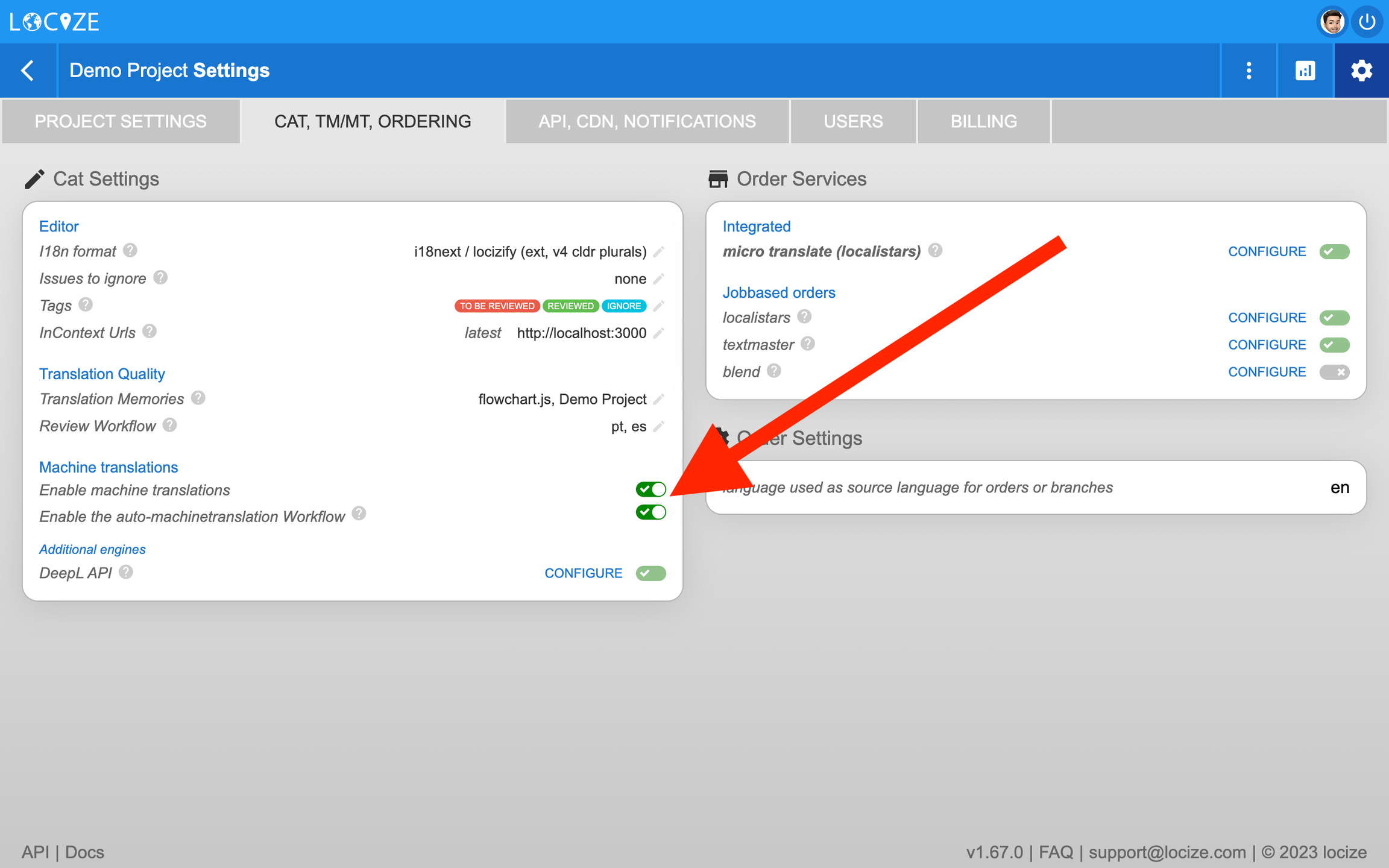 - In Cat settings, enable Enable the automatic translation Workflow.