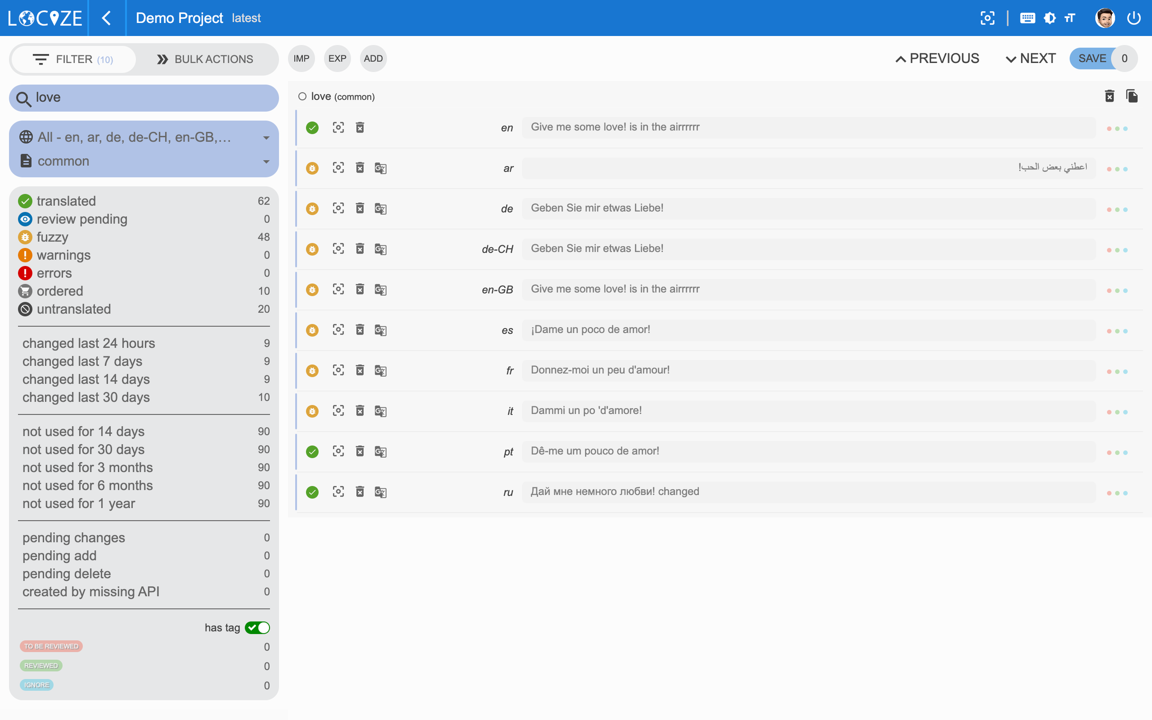 - Existing keys are not translated automatically. To translate existing content, use Bulk actions (see below).
