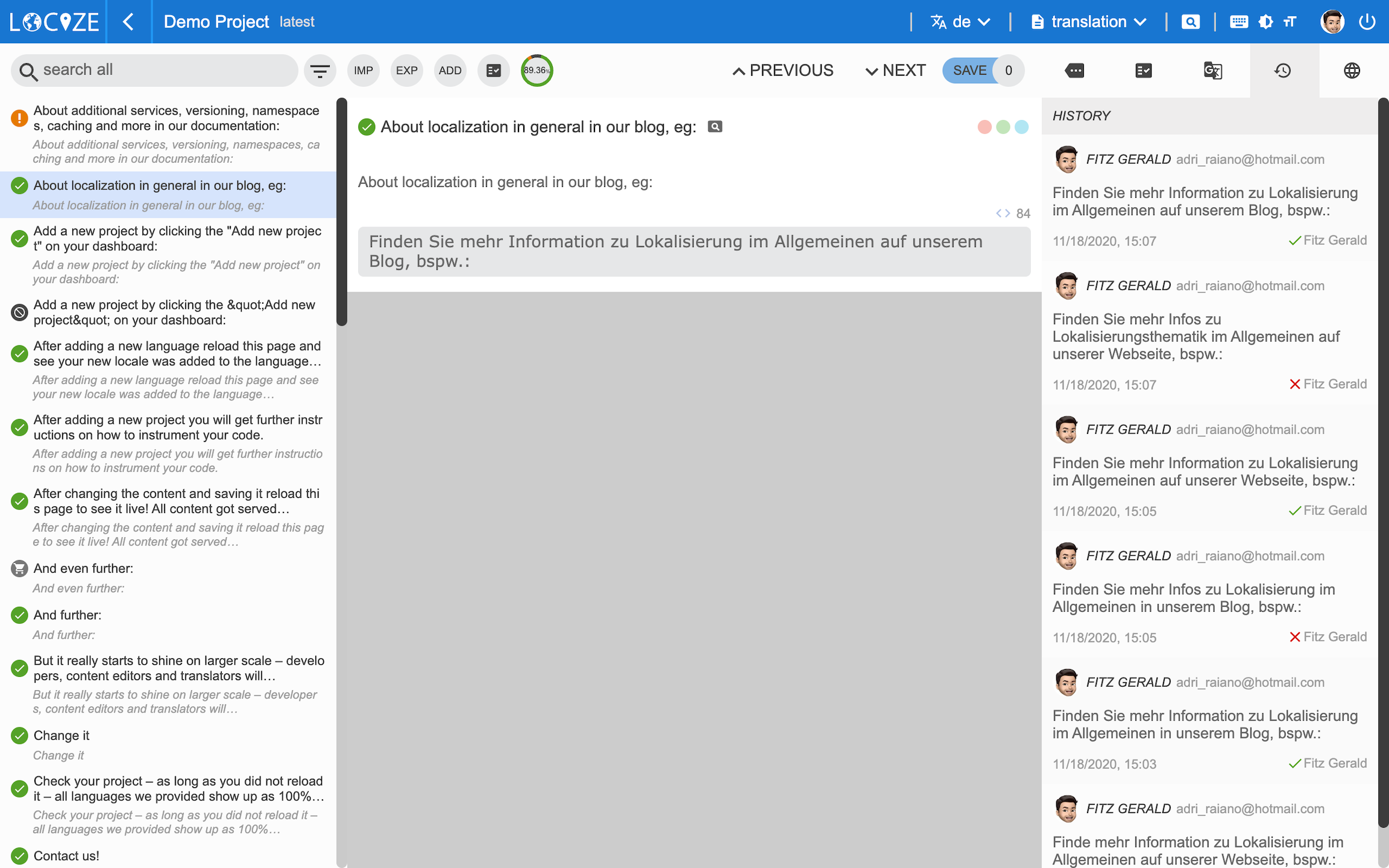 History enables you to track the last changes done to your translations. It empowers you to prove anytime when a content fragment was changed.