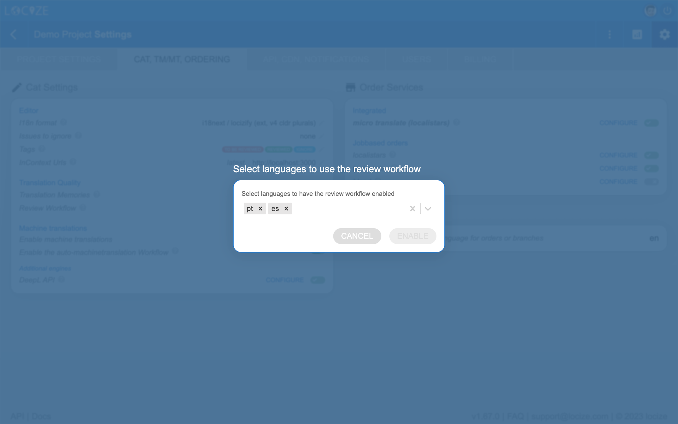 You can enable review workflows for specific languages by navigating to your project settings page, in the "EDITOR, TM/MT, ORDERING" tab and clicking the "Review Workflow" section in the "Cat settings" card.